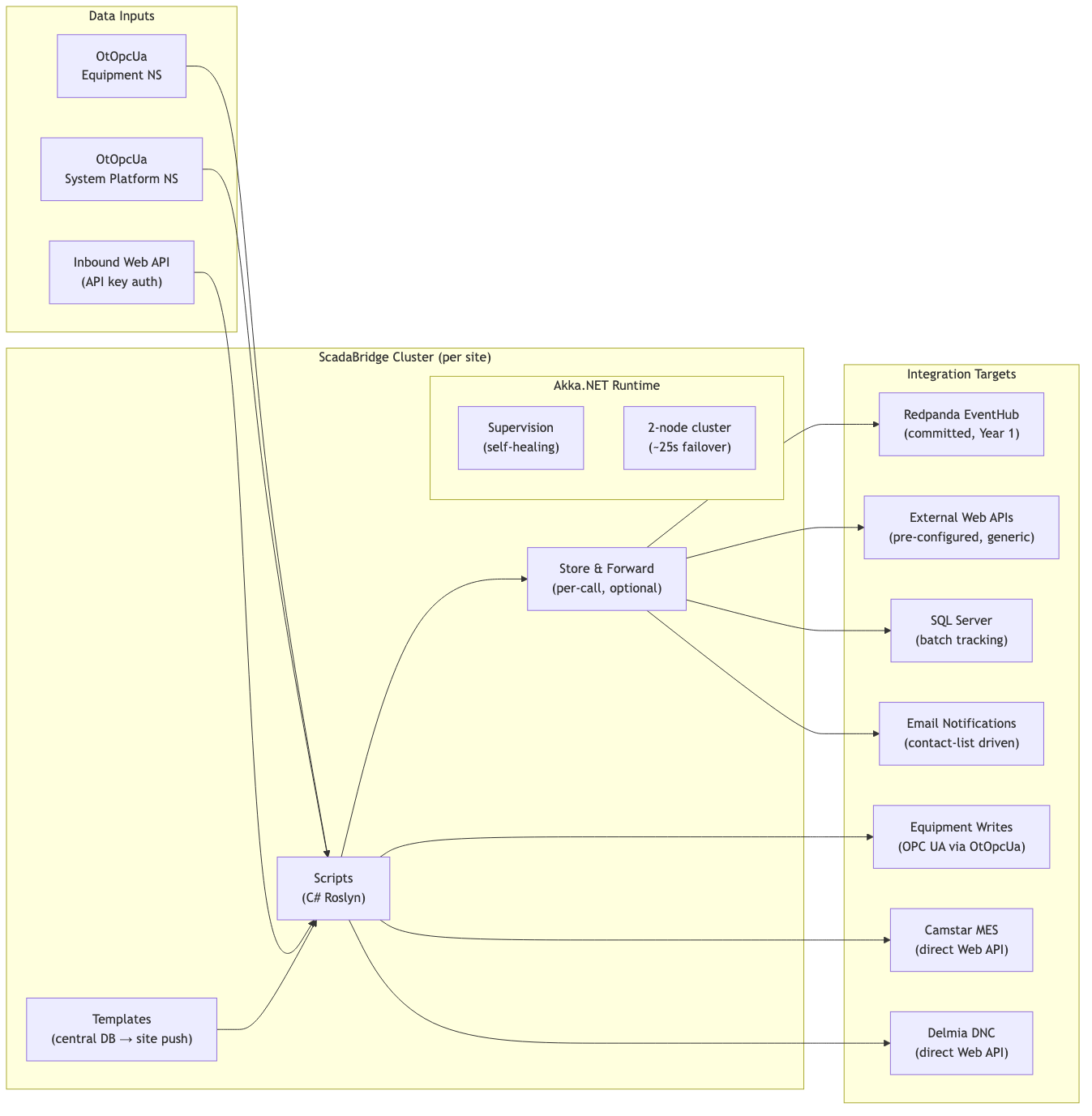 Dataflow: inbound Web API (API key auth) added as a third input to scripts Topology: API callers shown with two paths — direct to any site cluster OR routed through central hub to reach sites